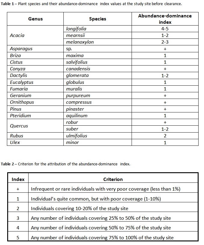 Conclui-se que a maioria do coberto vegetal era maioritariamente constituído pela espécie invasora Acacia longifolia. Outras espécies presentes com alguma significância foram as também invasoras Acacia melanoxylon e Acacia mearnsii, juntamente com as espécies nativas Rubus ulmifolius, Quercus suber e Dactylis glomerata. Numa escala residual encontraram-se ainda as nativas Ulex minor, Pteridium aquilinum, Cistus salvifolius, Briza maxima e Fumaria muralis e a espécie exótica Eucalyptus globulus.