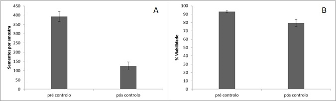 Figura 1 - Média do número de sementes de Acacia spp. do banco de sementes (A) e percentagem de viabilidade de sementes de Acacia spp. (B) antes de limpeza do coberto vegetal (pré controlo) e 20 meses após a limpeza do coberto vegetal (pós controlo). Média + Erro Padrão (A - n=40 e B - n=1000)